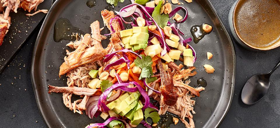 Servér coleslaw toppet med stykker af pulled pork, og pynt evt. med hakkede peanuts.