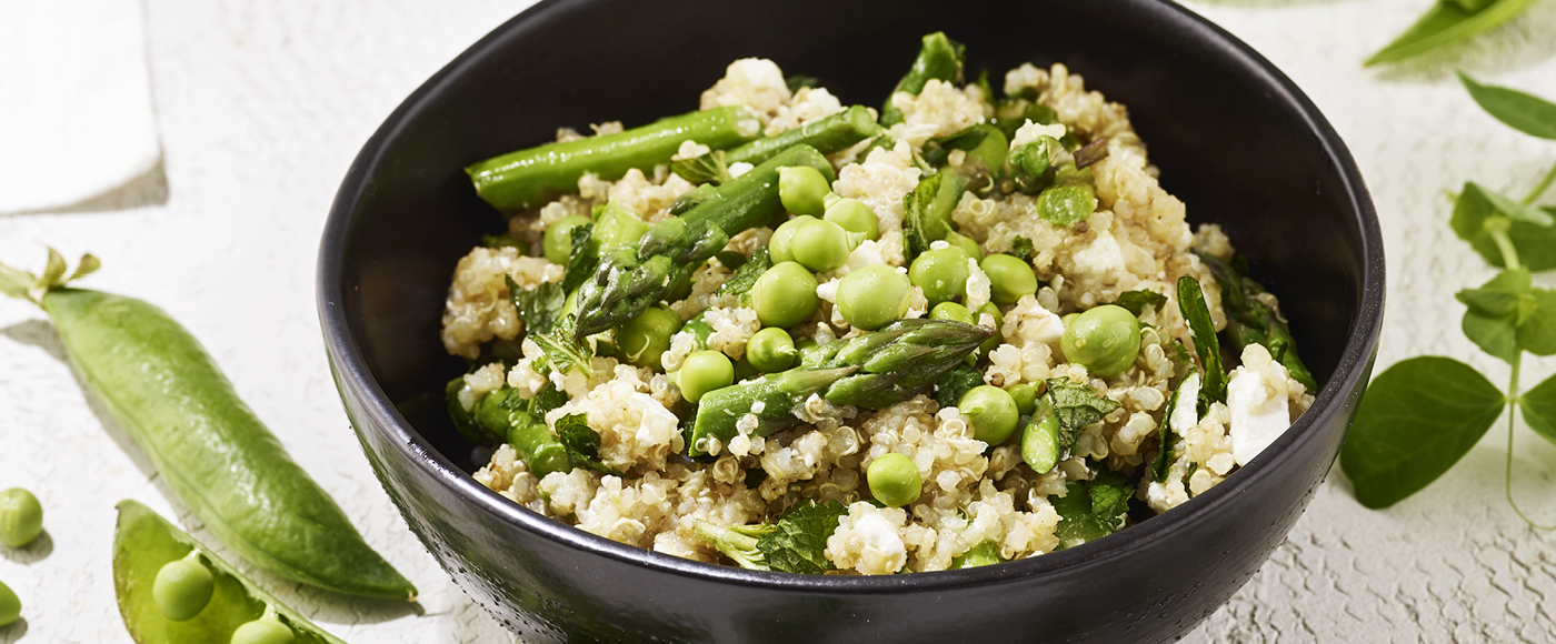 Kom asparges og rå ærter i en skål sammen med quinoa og vend citronsaft og olivenolie i.