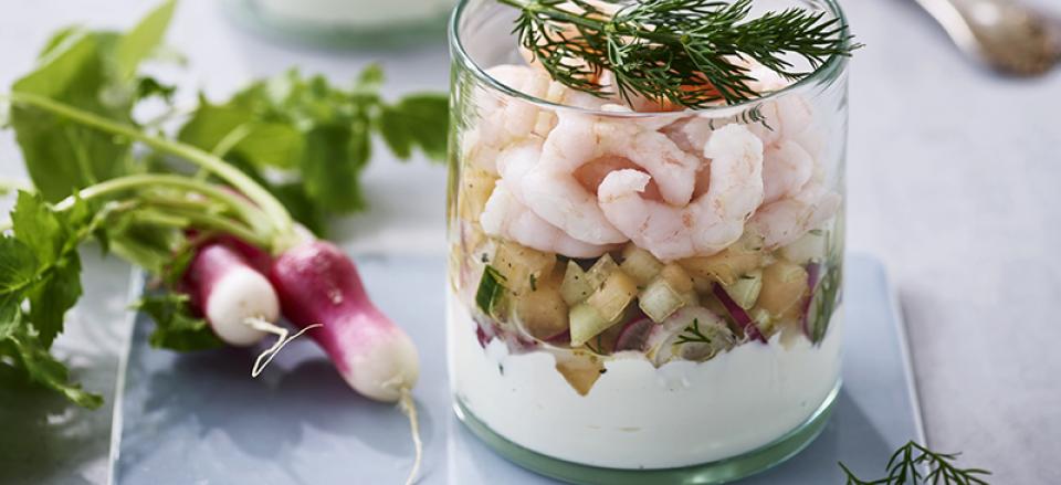 Kom rygeostcreme i bunden af fire glas eller skåle, og anret melonsalat og rejer over.