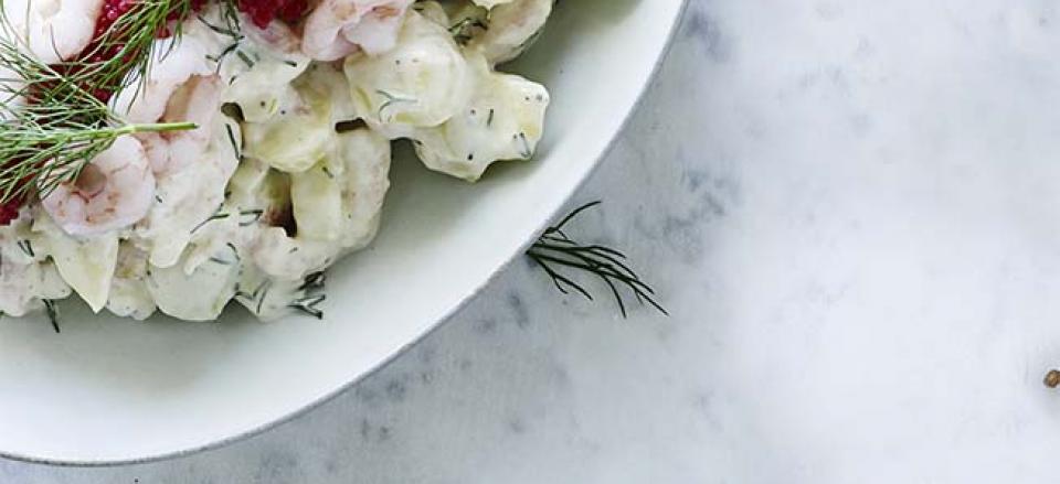 Skær kartoflerne i mindre stykker og kom i en skål med rejer og æble i tern.