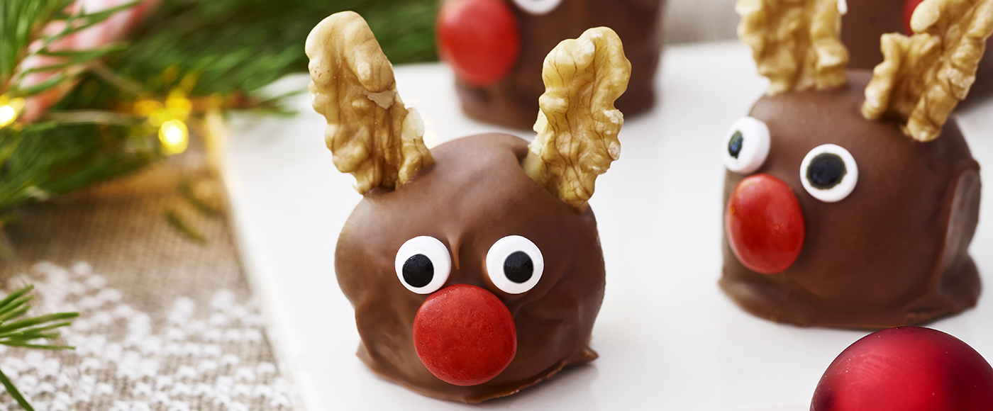 Rensdyr-marcipankugler med nougat og makroner