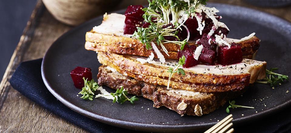 Ribbenssteg som smørrebrød med rødbedekompot og peberrod