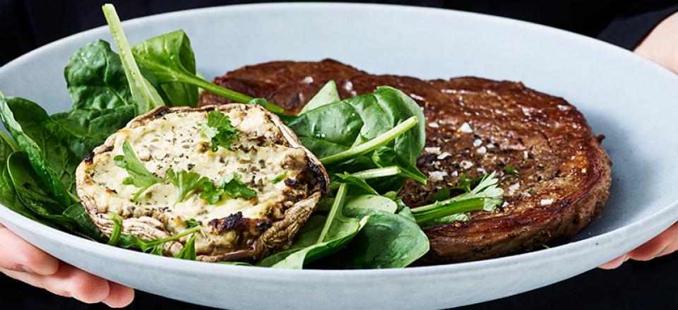Ribeye med spinatsalat og gratinerede portobellosvampe