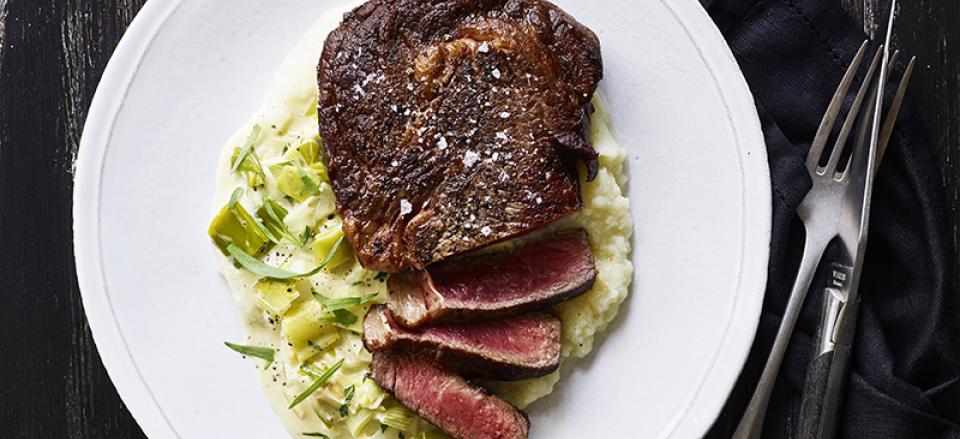 Ribeye steak m/ blomkålspuré og cremet porresauté