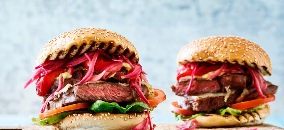 Læg bollerne sammen med salat, bøf, grillet peberfrugt, syltede løg og tomater.