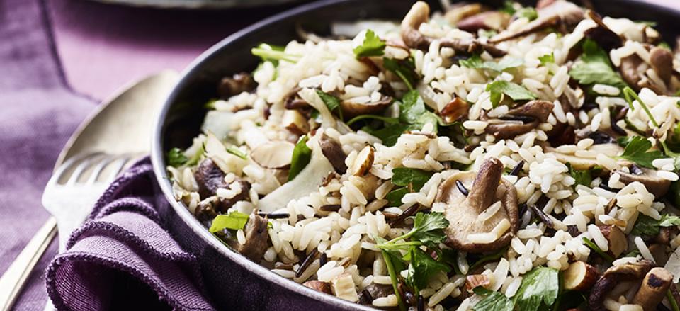 Bland svampe og løg i risene sammen med grofthakket persille, citronsaft, hakkede mandler og parmesan.