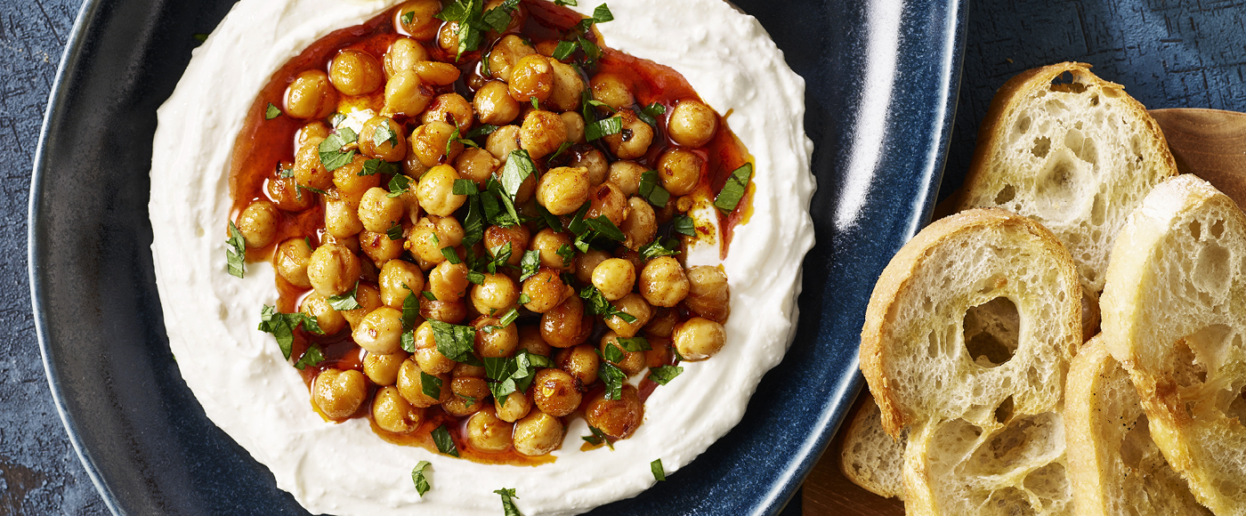 Servér med fx pitabrød skåret i trekanter eller ristet eller grillet brød.