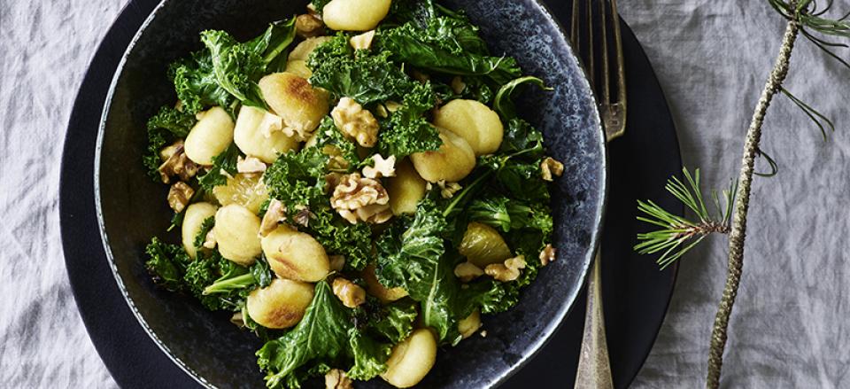 Kog gnocchien i 2 minutter i saltet vand, og sigt vandet fra. Fjern stilkene fra grønkålen, og riv den i grove stykker. Fjern stenene fra dadlerne, og del dem i halve. Hak valnødderne groft. Skær skallen af appelsinen, og skær fileter ud. Skær Romaine salaten i grove stykker. Pres saften af resten af appelsinen og bland med balsamico og 2 spsk olivenolie. Krydr med salt og peber. Varm 1 spsk olie i en pande, og rist grønkålen ved høj varme i ca. 5 min. På en ren pande varmes resten af olien, og den kogte gnocchi steges gylden ved høj varme. Vend gnocchien sammen med grønkål, dadler, appelsinfileter, radicchio og dressing og drys med de hakkede valnødder. Energi pr. person: 1976KJ/472Kcal. Næringsindhold pr. 100 g: Protein: 3,4 g. Kulhydrat: 28,4g. Fedt: 5,2 g.
