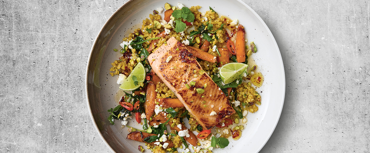 Top med et stykke ristet laks og drys med de hakkede pistacienødder, mynte og smuldr til sidst med feta.