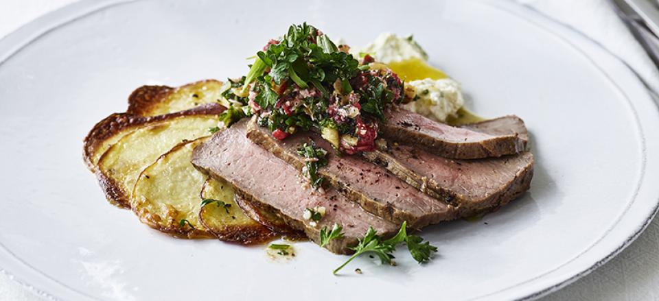 HjemOpskrifterRoastbeef med persille-hindbær pesto og parmesankartofler med estragonfløde