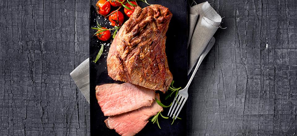 Skær tynde skiver af kødet og anret med skysauce, figner og ristede svampe.