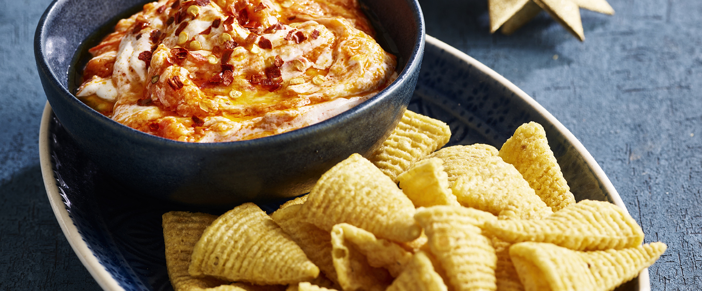 Kom dippen i en skål og top med resten af pestoen samt lidt olivenolie og chiliflager.