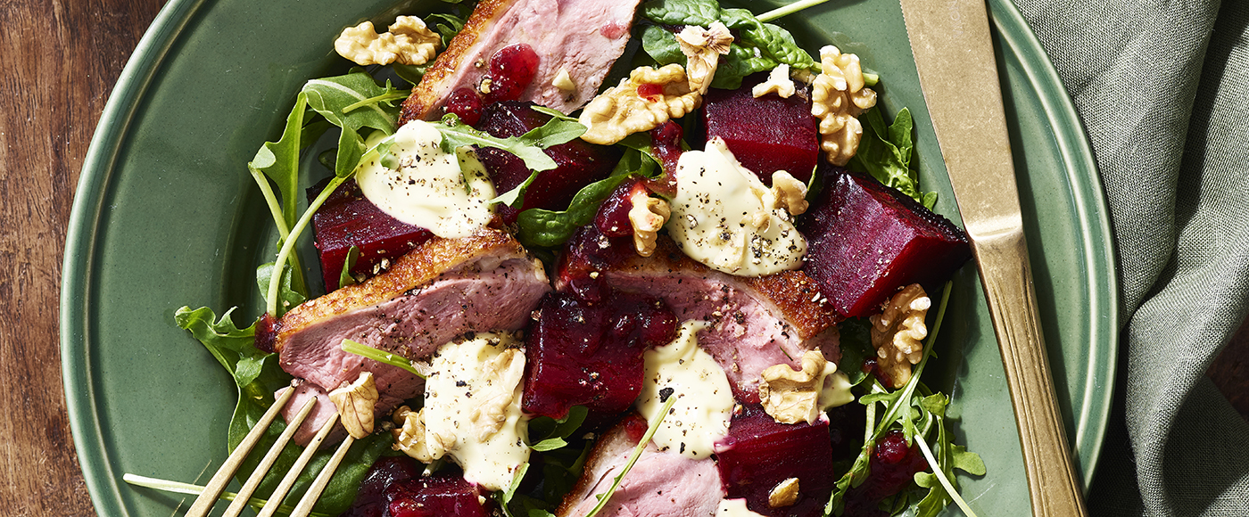 Rødbedesalat med andebryst, tyttebær og trøffelbearnaise