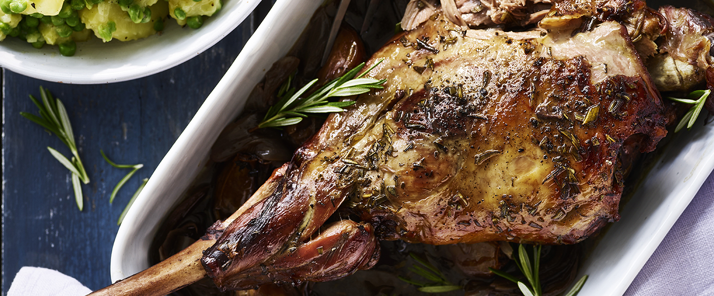 Rødvinsbraiseret lammekølle med rosmarin og knuste kartofler med ærter