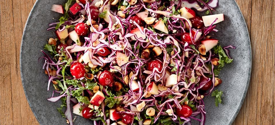 Vend dressingen i salaten og top med hakkede, ristede hasselnødder og glaserede tranebær.