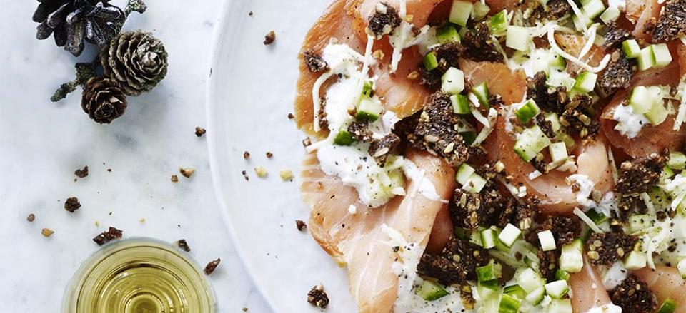 Røget laksecarpaccio med peberrod og agurk