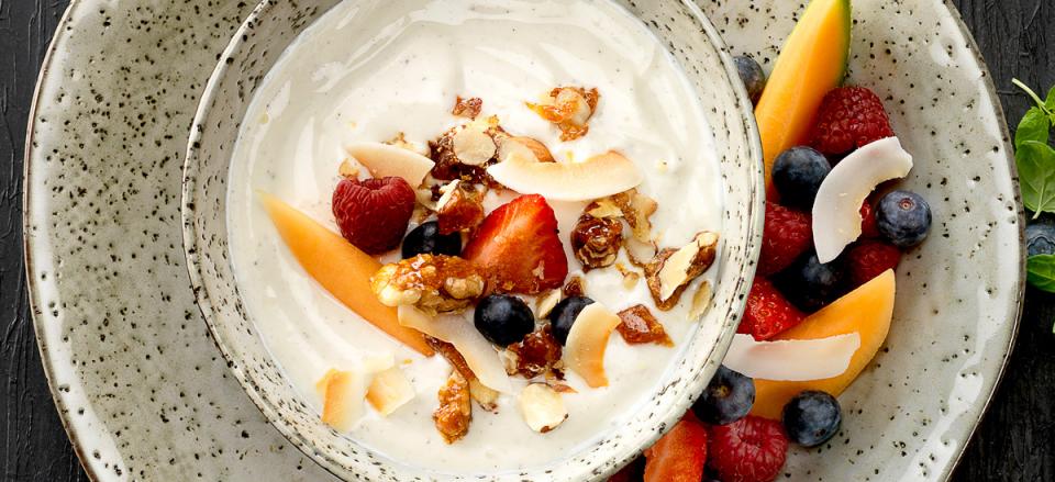 Rørt skyr med vanilje, karamelliserede nødder og frisk frugt