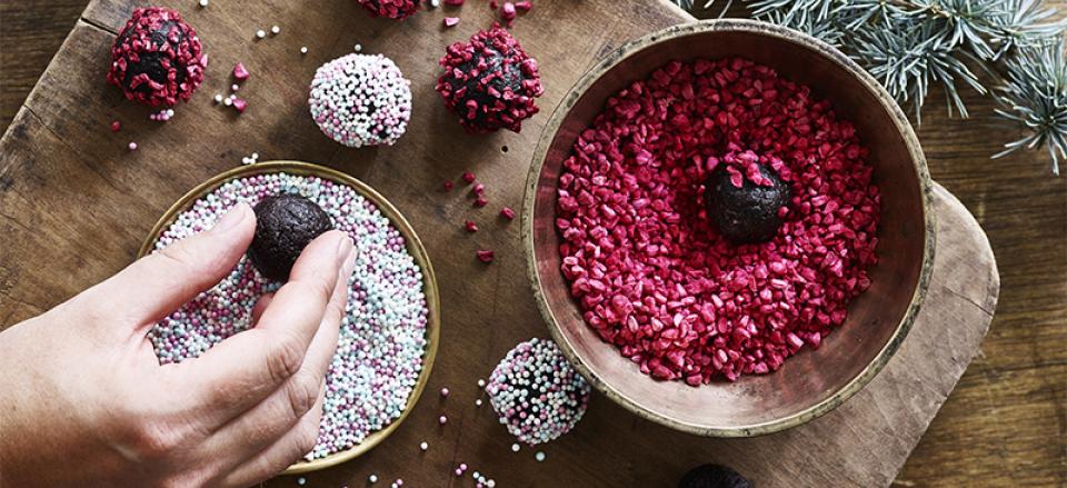 Tril massen til små romkugler og tril dem i krymmel eller frysetørrede hindbær.