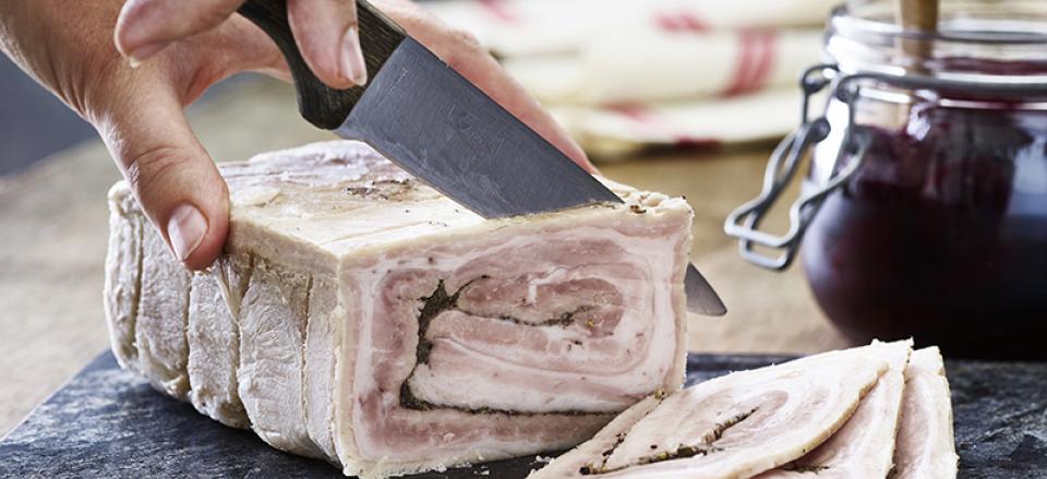 Kom den herefter i en rullepølsepresse og lad den presse i et døgn i køleskabet.