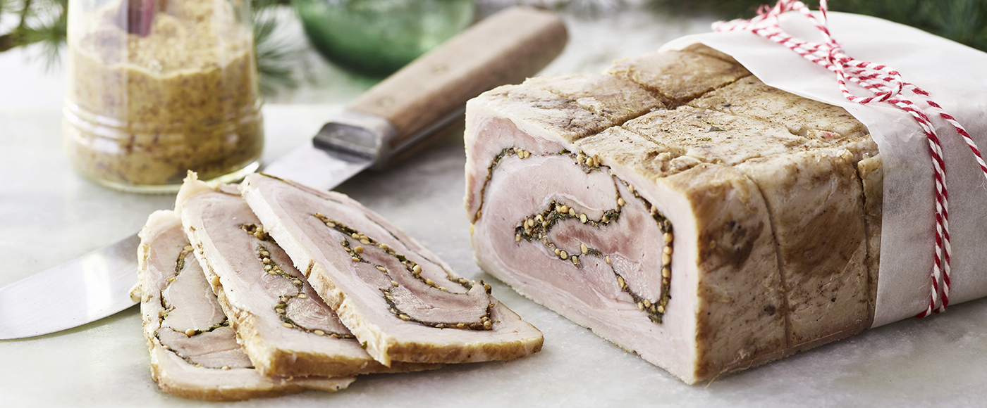 Rullepølse med persille, sennepskorn og brown ale