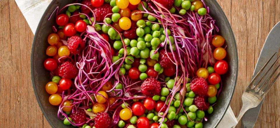 Salat af ærter, sommerspidskål, hindbær og tomater