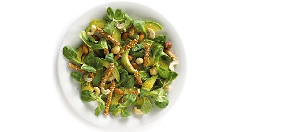 Læg lagvis nødder, avocadoskiver og grissini-stænger på salaten.