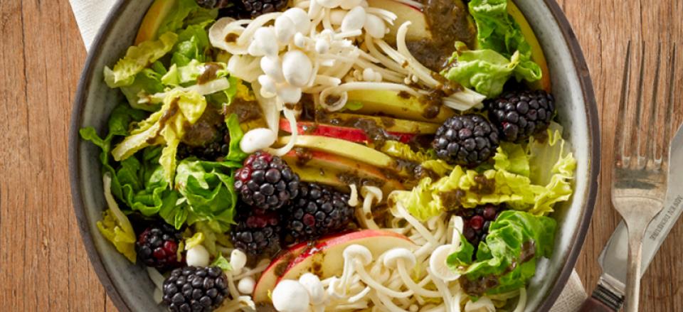 Frigør Enoki svampe fra rødderne og vend dem forsigtigt sammen med æbler, brombær, hjertesalat og flydende ramsløg i en skål.
