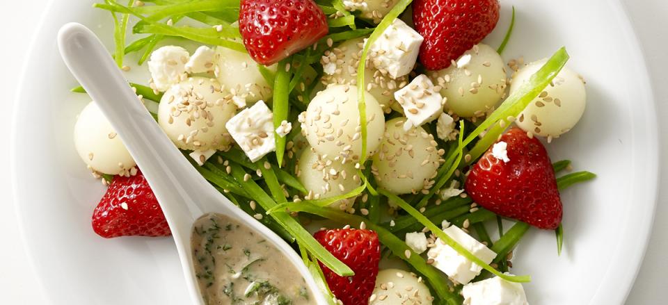 Salat med Cantaloupemelon, jordbær og ristet sesam