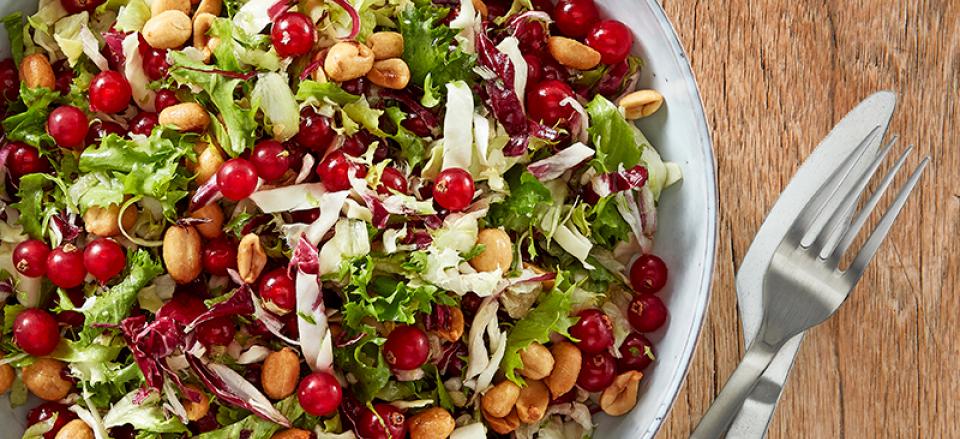 Bland salat og ribs med saltede peanuts og avocadoolie.