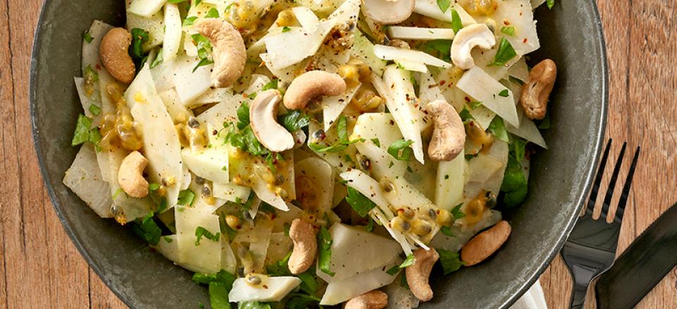 Bland glaskål og løvstikke med passionsfrugtsdressingen.