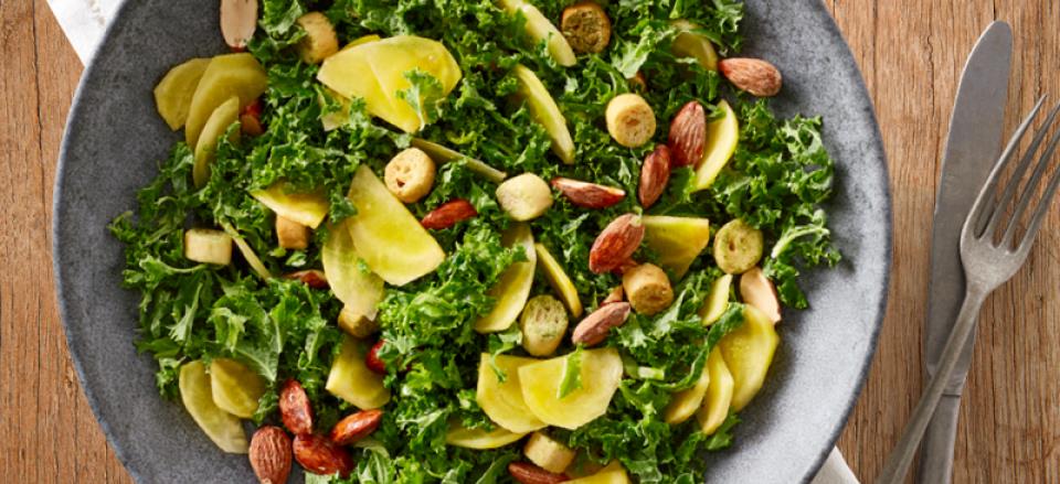 Salat af grønkål, gule beder, saltmandler og croutoner