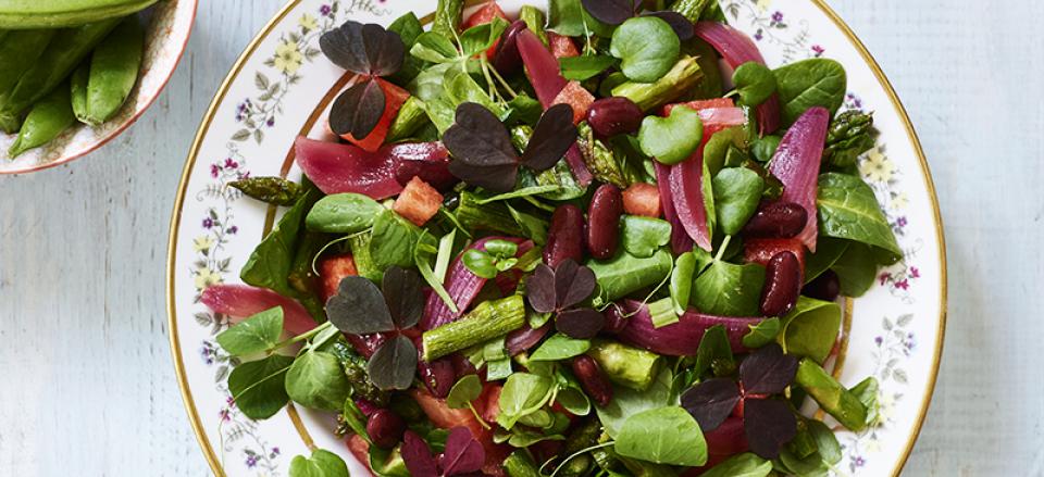 Vend det hele med dressingen, men gem lidt krydderurter og vandmelon til at pynte med til sidst.