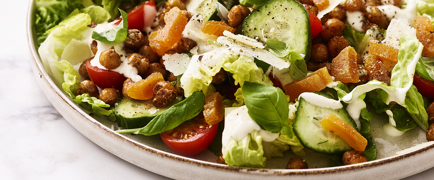 Hæld dressingen over salaten, og top med basilikum, abrikoser og parmesanflager.
