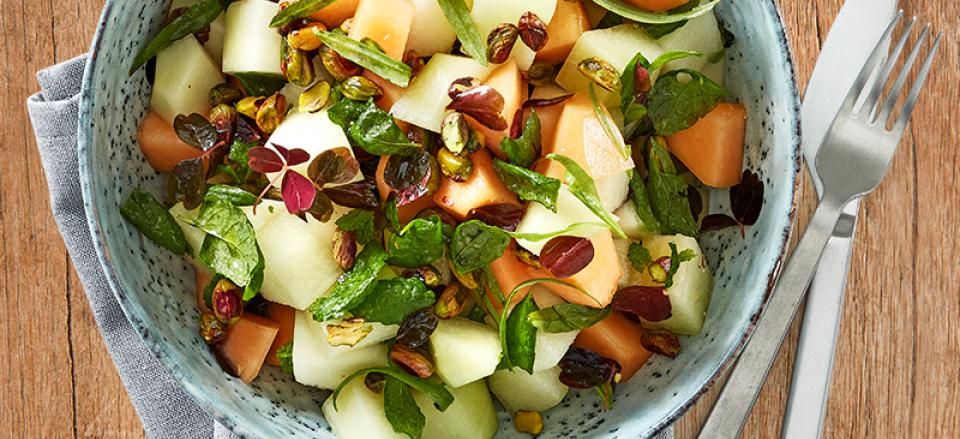 Salat af melon, krydderurter og saltede pistaciekerner