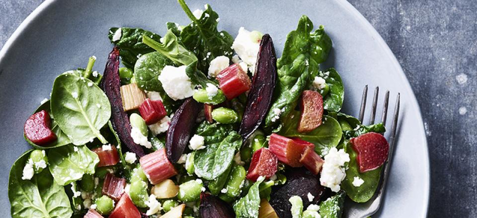 Salat med råmarinerede rabarber, edamamebønner, feta og bagte rødbeder