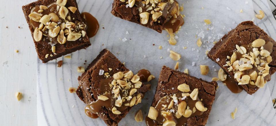 Skær kagen ud i firkanter og servér med karamelsauce og hakkede peanuts over.