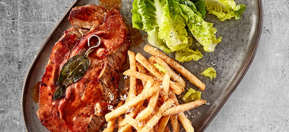 Læg et stykke parmaskinke på hvert kødstykke og placer et salvieblad på parmaskinken.