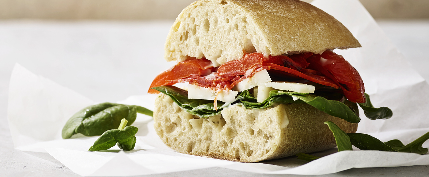 Sandwich med grillet peberfrugt, chorizo og manchego