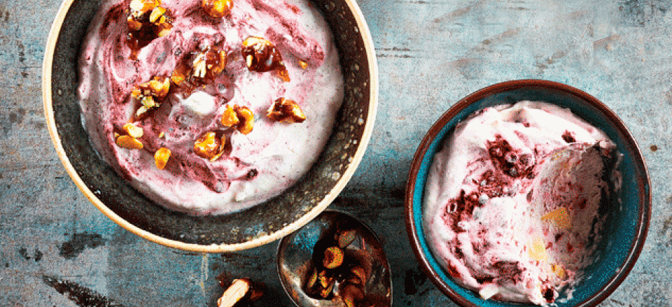 Drop f.eks. bærrene og kom i stedet vaniljekorn og knust marengskys, saltede karamelliserede nødder eller mørk chokolade i.