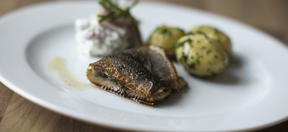 Finhak udkernet agurk, radiser og purløg og rør i rygeostcremen.