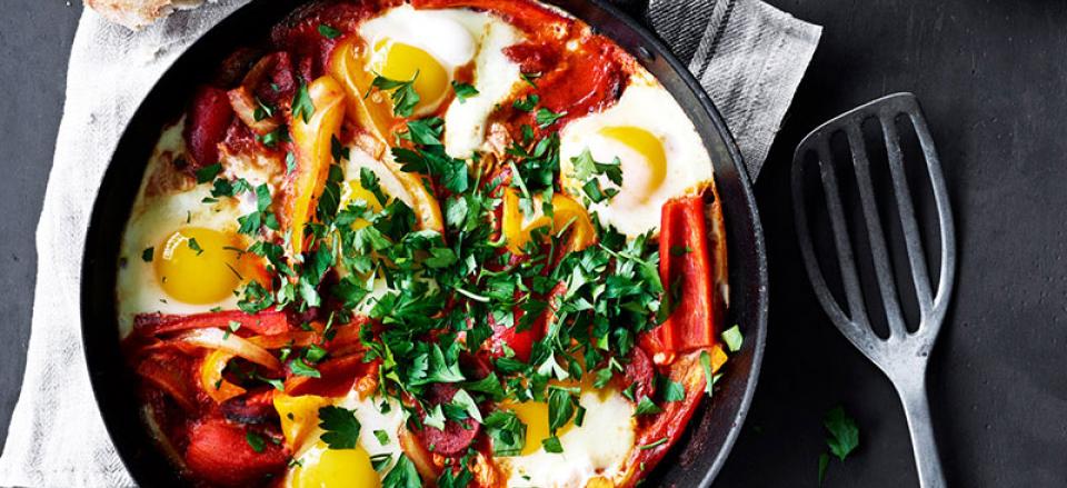 Shakshuka med chorizo og peberfrugter