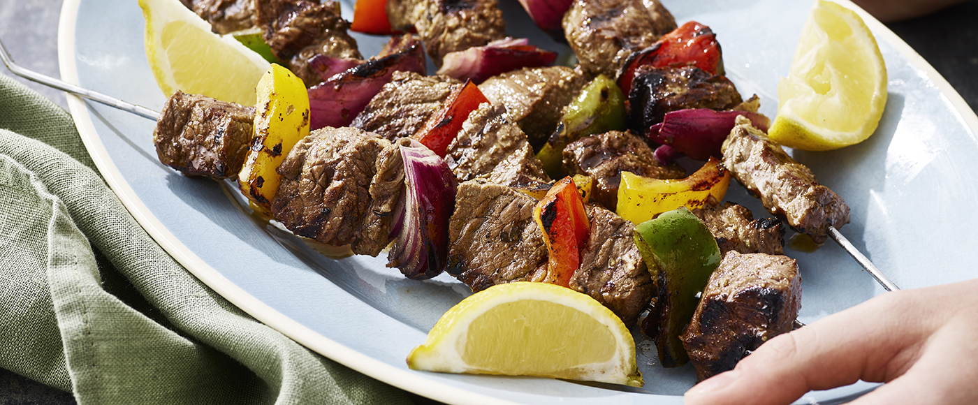 Tag kødet op af marinaden, og kom det på spyd sammen med peberfrugter og løg.