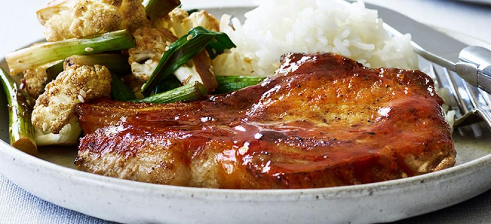Skaftkoteletter med teriyakistegt blomkål og forårsløg