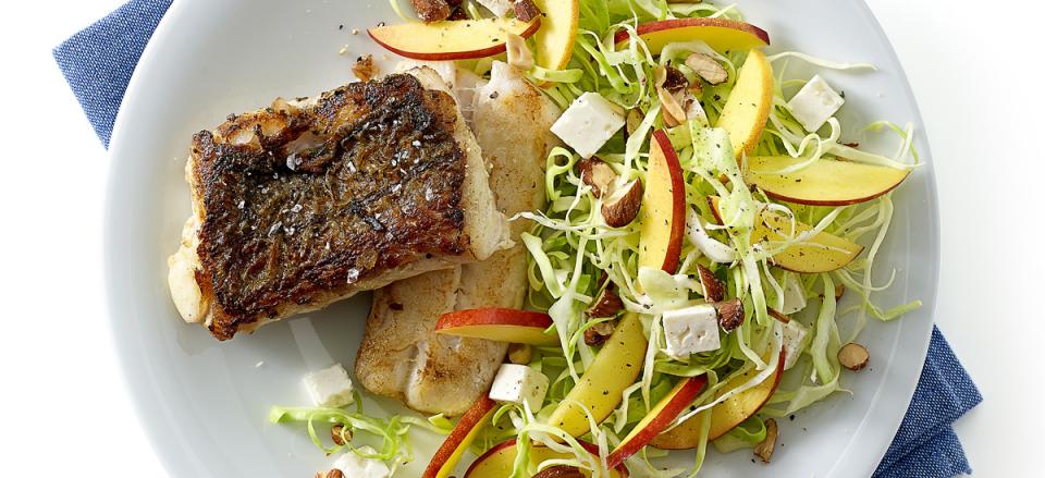 Bland spidskål med nektariner, salatosttern, mandler, kværnet peber, lys balsamico og olivenolie.