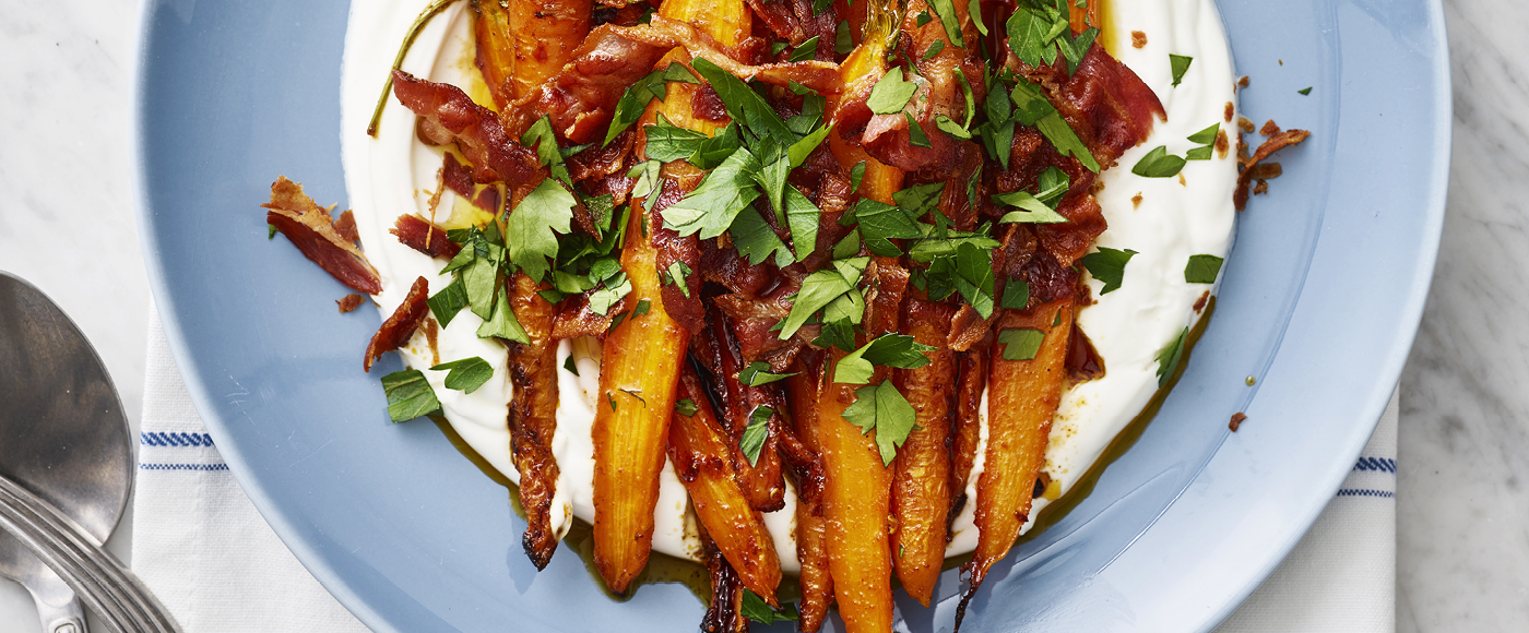 Skyr med bagte, honningglaserede gulerødder og baconkrymmel