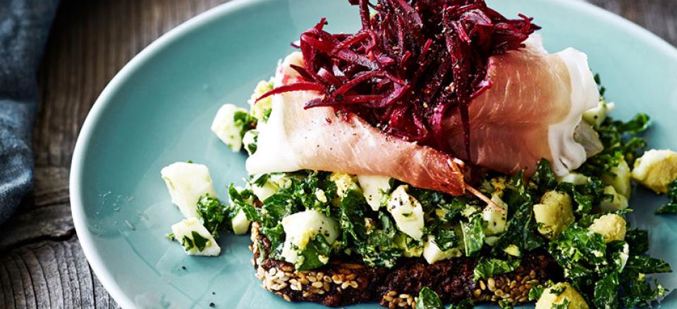 Smørristet rugbrød og æggesalat med grønkål, råmarinerede rødbeder og skinke