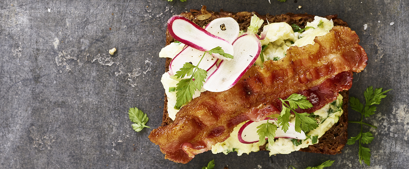 Læg dit røræg på rugbrød, og pynt med bacon, radiser og ekstra krydderurter.