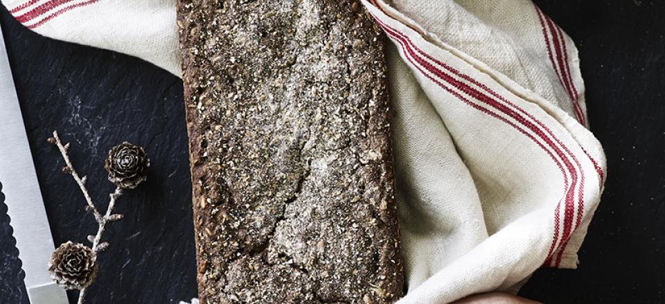 Alt røres grundigt sammen. Lad dejen hvile i 30 min. og rør den godt igennem igen. Kommes i smurt 1 liters form og glattes. Hæves tildækket 1-1,5 time et lunt sted. Sættes i forvarmet ovn på 220°C – skru ned til 180°C og bag i en ca. time. Vent! Og nyd, når brødet er helt koldt og sprødt. Opbevar rugbrød i en plastpose et køligt og mørkt sted. Kan også fryses. Energi pr. 100g: 841KJ/201Kcal. Næringsindhold pr. 100 g: Protein: 6,4 g. Kulhydrat: 28,4 g. Fedt: 4,9 g.