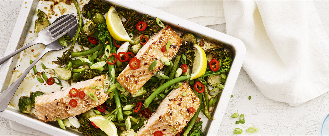 Soja-ingefær laks med broccoli og rosenkål