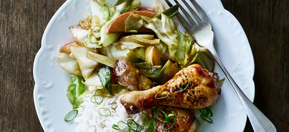 Sojamarineret kylling med wokstegt kål